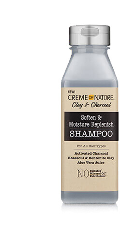 Creme of Nature Clay & Charcoal Soften & Moisture Replenish Shampoo doordrenkt met een mix van Marokkaanse Rhassoul Clay, Bentonite Clay en Activated Charcoal reinigt onze Soften & Moisture Replenish Shampoo zachtjes zonder je haar van zijn natuurlijke vocht te ontdoen en houdt kroezen onder controle.