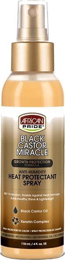 African Pride Black Castor Miracle Anti-Humidity Heat Protectant Spray, antivochtigheid hittebeschermer biedt bescherming tegen schade door hitte tools. Deze lichtgewichte formule is speciaal vervaardigd met een keratinecomplex en verzegeld vocht en haar in je haar en houdt het haar recht voor 2 weken of tot de volgende wasdag.
