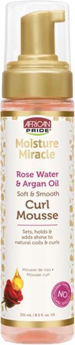 African Pride Moisture Miracle Rose Water & Argan Oil Soft & Smooth Curl Mousse, is een lichtgewicht schuimmouse van rozenwater en arganolie gemaakt om het haar te verzorgen, volume te geven, krullen te controleren en een flexibele fixatie toe te voegen. Maakt krullend en natuurlijke stijlen gedefinieerd, pluisvrij en zacht.