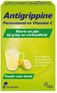 Antigrippine Paracetamol Vitamine C 500/50mg Poeder bevat twee werkzame stoffen: paracetamol en vitamine C. Paracetamol behoort tot de pijnstillende en koortsverlagende middelen. Paracetamol remt de aanmaak van stoffen in het lichaam die pijn en koorts veroorzaken, waardoor u hiervan minder last heeft. Antigrippine Paracetamol en Vitamine C wordt gebruikt bij koorts en pijn bij griep en verkoudheid. Dosering De aanbevolen dosering is: Volwassenen: Gebruik 1 sachet (= 500 mg paracetamol en 50 mg vitamine C) per keer. U mag maximaal 6 sachets (= 3000 mg paracetamol en 300 mg vitamine C) per dag gebruiken. De sachets zijn niet geschikt voor gebruik door kinderen. Wijze van innemen: Schud de inhoud van het sachet in een glas of beker. Voeg vervolgens 150 ml warm water toe, roer goed en drink onmiddellijk na roeren. Waarschuwingen Wordt uw klacht na 14 dagen niet minder, of wordt hij zelfs erger? Neem dan contact op met uw arts.