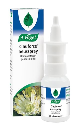 A.Vogel Cinuforce neusspray® is een homeopathisch geneesmiddel* zonder specifieke therapeutische indicatie toegepast volgens de principes van de homeopathische geneeswijze. Het is vanwege wetgeving niet mogelijk om op de website meer informatie te geven over dit product. Via een persoonlijk contact mogen wij u wèl advies geven en u informeren over dit product. Op de verpakking van homeopathische geneesmiddelen mag door nieuwe wetgeving vanaf 1 september 2012 niet meer vermeld worden waar het middel voor bedoeld is. Tip: Op de website van zelfzorg.nl staat een zogenaamd historisch overzicht van homeopathische geneesmiddelen en voor welke klacht zij tot 2013 geregistreerd stonden. Dosering en gebruiksaanwijzing Tenzij anders is geadviseerd 3-5x daags 1 á 2x sprayen per neusgat. Kinderen van 2-6 jaar: 2-3x daags 1 spray per neusgat. Kinderen van 6-12 jaar: 3-5x daags 1 spray per neusgat. •De neus eerst snuiten of schoonmaken. •Verwijder het blauwe beschermdopje van de doseerspray. Hou het flesje onderaan met de duim vast en hou het witte bovenstuk tussen wijs- en middenvinger. •Indien u de spray voor het eerst gebruikt, probeer hem dan eerst even uit door verschillende keren na elkaar in de lucht te verstuiven. •De doseerspray is nu klaar voor verder gebruik. •Breng het neusstuk in het neusgat. Spray één keer en adem tegelijkertijd in door de neus. Herhaal dit in het andere neusgat. •Maak na gebruik het uiteinde schoon en plaats het dopje terug. •Om hygiënische redenen mag elke doseerspray slechts door één en dezelfde persoon gebruikt worden. * Lees voor gebruik de bijsluiter.