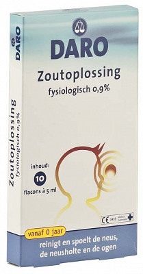 De Daro Zoutoplossing fysiologisch reinigt en spoelt de neus, de neusholte en de ogen. DARO Zoutoplossing fysiologisch 0,9% is zodanig samengesteld, dat het overeenkomt met het lichaamseigen traan- en neusvocht, waardoor irritatie voorkomen wordt. -Om vrijer te ademen door de neus. -Reinigt en spoelt de neus, de neusholte en de oog bij verkoudheid. -Reinigen van de oogjes bij zuigelingen en jonge kinderen. -Steriel, dus hygiënisch. -Ook voor reiniging van wondjes. -Bevat geen conserveringsmiddelen en is gemakkelijk in het gebruik. Daro Zoutoplossing fysiologisch is een medisch hulpmiddel. Lees voor gebruik de gebruiksaanwijzing