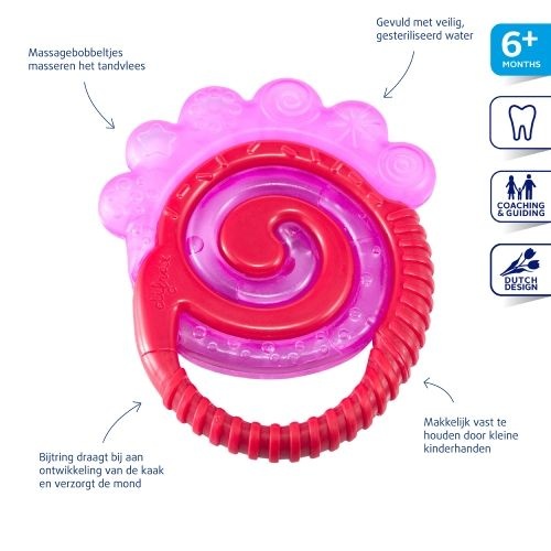 Spelen prikkelt de fantasie en zorgt ervoor dat een kindje zich motorisch ontwikkelt. Dit bijtspeeltje kan gemakkelijk worden vastgepakt. Met massagebobbeltjes om op te sabbelen. Een gekoelde bijtring verdooft het tandvlees een beetje en biedt daardoor verlichting bij het doorkomen van tandjes. Leg de bijtring een half uur in de koelkast. Daarna kan het kindje erop sabbelen. Bijtring niet uitkoken, maar schoonspoelen onder de warme kraan. PVC vrij. Gevuld met veilig, gesteriliseerd water. Verschillende kleuren