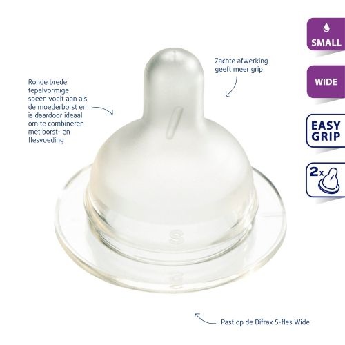 Brede tepelvormige speen waardoor baby?s snel wennen aan het drinken uit een fles. De speciale zachte afwerking voelt aan als de moederborst. Hierdoor zijn borst- en flesvoeding goed te combineren. Small: voor melk en normale drinkers vanaf 0 maanden of voor oudere snelle drinkers