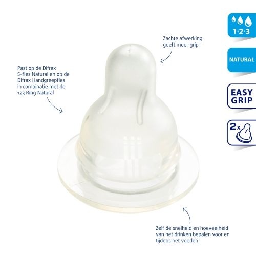 Ronde tepelvormige speen waardoor baby?s snel wennen aan het drinken uit een fles.De speciale zachte afwerking voelt aan als de moederborst. Hierdoor zijn borst- en flesvoeding goed te combineren. Met de drie standen speen (| =klein gaatje, || =medium gaatje en ||| =groot gaatje) bepaalt u zelf de hoeveelheid en snelheid van het voeden. Voor melk en pap vanaf 0 maanden.