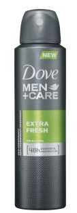 Dove Men+Care Extra Fresh deospray heeft een verfrissende en energieke geur. Een mannelijk parfum dat doet denken aan de ongerepte en wilde natuur. De deodorants van Dove Men+Care combineren krachtige anti-transpirant ingrediënten voor een 48 uur effectieve bescherming tegen transpiratie en -geuren met ¼ hydraterende crème van Dove die de huid tegen irritaties beschermt