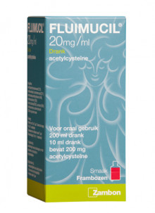 Fluimucil drank wordt gebruikt bij aandoeningen waarbij vastzittend slijm het ophoesten ervan moeilijker maakt zoals bij: bronchitis (ontsteking van het slijmvlies van de luchtpijp), astma, emfyseem, mucoviscidose (taaislijmziekte) en bij bronchiëctasieën (langdurige verwijding van een vertakking van de luchtpijp). Hoe werkt het? Acetylcysteïne is een slijmoplossend middel. Acetylcysteïne breekt taai vastzittend slijm af, zodat het dunvloeibaar wordt en gemakkelijk kan worden opgehoest. Acetylcysteïne is afgeleid van het natuurlijke aminozuur cysteïne. Cysteïne wordt gebruikt voor de opbouw van glutathion. Door gebruik van acetylcysteïne kan een tekort aan glutathion worden aangevuld. Dosering Mits niet anders voorgeschreven door de arts: - Kinderen tot 7 jaar: 1 maatbeker a 200 mg (= 10 ml), tweemaal daags - Volwassenen en kinderen ouder dan 7 jaar : 1 maatbeker a 200 mg (= 10 ml), driemaal daags Fluimucil drank mag niet langer dan 14 dagen worden gebruikt zonder uw arts te raadplegen. Lees voor gebruik de bijsluiter Werkzame stof(fen) ACETYLCYSTEÏNE Contra indicaties Bekende overgevoeligheid voor acetylcysteïne of voor één van de hulpstoffen. Kinderen onder 2 jaar.