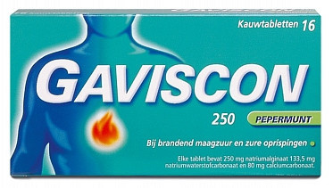 Bij brandend maagzuur en zure oprispingen. Last van brandend maagzuur of zure oprispingen? Gaviscon 250 Kauwtabletten geeft snelle verlichting van de klachten. De natuurlijke samenstelling legt een schuimlaagje bovenop de maaginhoud. Zo wordt het terugstromen van maagzuur naar de slokdarm voorkomen. Gaviscon werkt tot vier uur lang. De kauwtabletten met frisse pepermuntsmaak zijn handig voor thuis of onderweg. Lees vóór gebruik de bijsluiter. Lees voor gebruik de bijsluiter