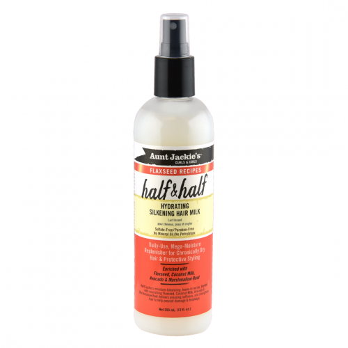 Aunt Jackie's Curls & Coils Flaxseed Recipes Half & Half Hydrating Silkening Hair Milk, vernieuwt droog n dorstig haar. Geformuleerd met voedende kokosmelk, avocado, lijnzaad en Marshmallow root. Deze speciale mix hydrateert, ontwart en verzacht. Geschikt voor alle types krullendhaar!