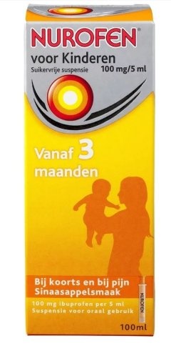 Bij koorts, pijn en ontstekingsreacties Bij pijn en koorts van uw kleintje biedt Nurofen voor Kinderen Suikervrije Suspensie snel verlichting. De suspensie is makkelijk te doseren en heeft een aangename sinaasappelsmaak. Het werkt snel, is ontstekingsremmend en koortsverlagend. Nurofen Kinderen Suikervrije Suspensie is geschikt voor kinderen van 3 maanden tot en met 12 jaar. Bevat 100 mg ibuprofen per 5 ml. Lees vóór gebruik de bijsluiter. Werkzame stof(fen) IBUPROFEN Contra indicaties Patiënten met een bekende overgevoeligheid voor ibuprofen, andere NSAID’s of andere bestanddelen van het product; Patiënten met een historie van bronchospasmen, asthma, rhinitis of urticaria, geassocieerd met acetylsalicylzuur of andere NSAIDs; Patiënten met een doorgemaakte of bestaande maagzweer of patiënten met een maagdarmbloeding; Patiënten met ernstig leverfalen, ernstig nierfalen of ernstig hartfalen; Gedurende de laatste drie maanden van de zwangerschap