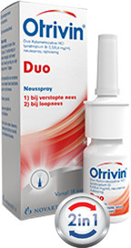 Verstopte neus en een loopneus? Otrivin Duo is de enige spray met een dubbele werking bij neusverkoudheid, die beide symptomen aanpakt. Opent je verstopte neus en vermindert je loopneus. Lees voor gebruik de bijsluiter Werkzame stof(fen) IPRATROPIUM BROMIDE-0-WATER SAMENSTELLING overeenkomend met IPRATROPIUM XYLOMETAZOLINEHYDROCHLORIDE SAMENSTELLING overeenkomend met XYLOMETAZOLINE Contra indicaties Otrivin Duo mag niet worden toegediend aan kinderen jonger dan 18 jaar vanwege onvoldoende gegevens. Overgevoeligheid voor één van de werkzame bestanddelen of voor één van de hulpstoffen. Bekende overgevoeligheid voor atropine of gelijkaardige stoffen, bijvoorbeeld hyoscyamine en scopolamine.Na heelkundige ingrepen waarbij de dura mater mogelijk is doorboord, bijvoorbeeld transsfenoïdale hypofysectomie of andere transnasale ingrepen.Bij patiënten met glaucoom.Bij patiënten met rhinitis sicca