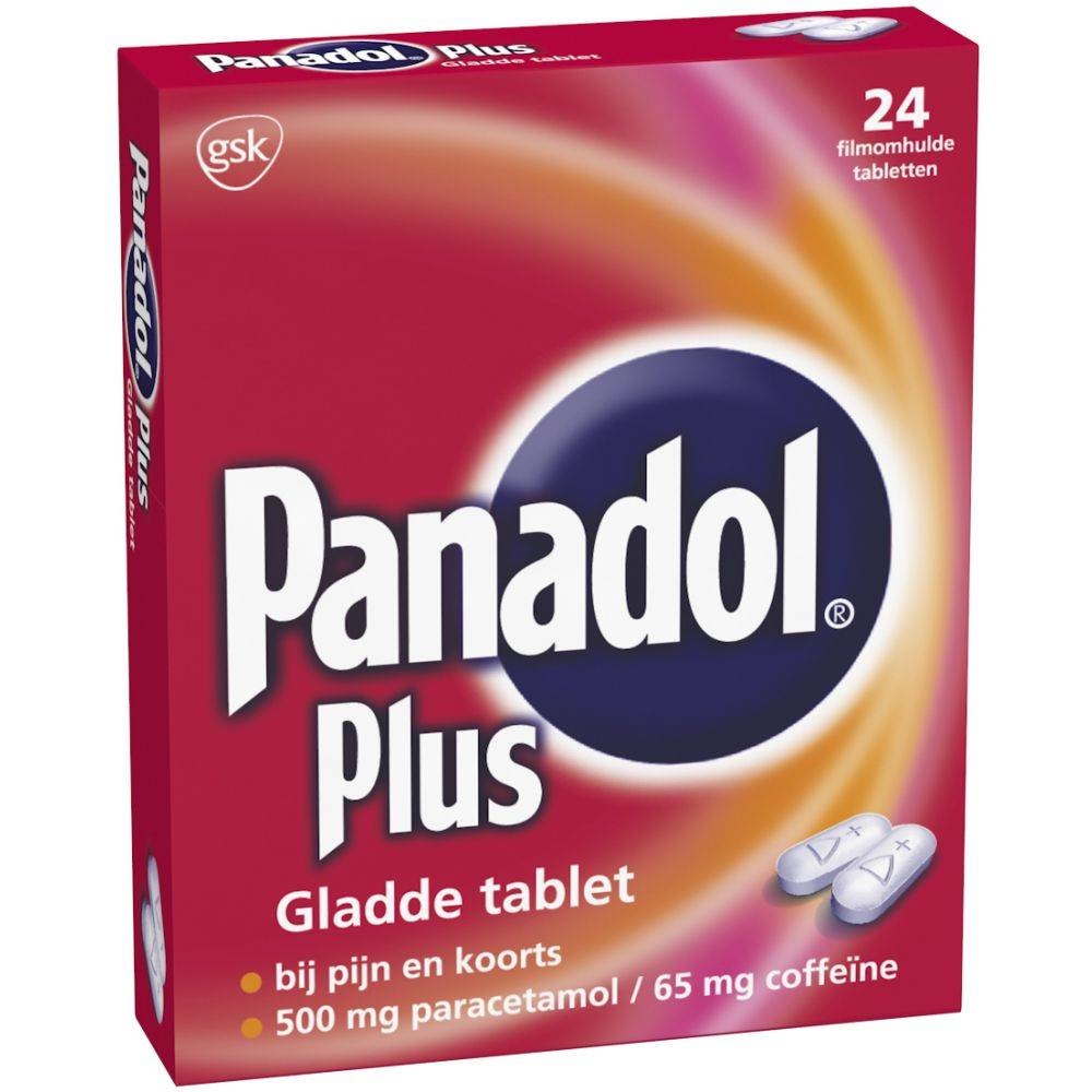 Bij hoofdpijn, migraine, koorts, griep, verkoudheid, keelpijn, bijholteontsteking, middenoorontsteking, oorpijn, artrose (versleten gewrichten), spierpijn, gewrichtspijn en menstruatieklachten. Werkzame stof De werkzame stoffen in Panadol Plus(R) Gladde Tablet zijn paracetamol 500 mg en coffeïne 65mg. Toepassing Paracetamol wordt gebruikt bij: - koorts en pijn bij griep en verkoudheid - koorts en pijn na vaccinatie - hoofdpijn - menstruatiepijn - spit - zenuwpijn - kiespijn - menstruatiepijn - spierpijn. Niet gebruiken bij - overgevoeligheid voor paracetamol - overgevoeligheid voor coffeïne Bijwerkingen Bijwerkingen die kunnen optreden zijn: - overgevoeligheidsverschijnselen (huiduitslag, koorts, galbulten) - coffeïne kan het inslapen bemoeilijken Als paracetamol met coffeïne langdurig wordt gebruikt, of meer dan 12 tabletten tegelijk worden ingenomen, kan leverbeschadiging optreden. Gebruik tijdens zwangerschap en borstvoeding Over het gebruik van paracetamol in de zwangerschap bij de mens bestaan onvoldoende gegevens om de schadelijkheid te beoordelen. Paracetamol wordt uitgescheiden met de moedermelk. Bij normale doseringen is tot nu toe geen schadelijke invloed op het kind gevonden. Invloed op de rijvaardigheid Geen invloed. Wisselwerkingen Paracetamol vertraagt de uitscheiding van chlooramfenicol (een bepaald antibioticum) en versterkt de bijwerkingen van zidovudine (een AIDS middel). Bij alcoholmisbruik en bij gelijktijdig gebruik van geneesmiddelen die de activiteit van de lever verhogen (b.v. bepaalde epilepsiemiddelen) kan een overdosering van paracetamol ernstiger verlopen door verhoogde en versnelde vorming van giftige afbraakprodukten. Wanneer u één van de bovenstaande geneesmiddelen of een ander geneesmiddel gebruikt, moet u hiermee rekening houden en advies vragen aan uw arts of apotheker. Waarschuwing en voorzorgsmaatregelen Bij stoornissen in de lever- en nierwerking moet u extra voorzichtig zijn met het gebruik van paracetamol. Bij chronisch alcohol gebruik mag u niet meer dan 2 g paracetamol per dag gebruiken (= 4 tabl. à 500 mg). Niet langdurig gebruiken. Als de klachten veranderen, terugkeren of niet overgaan, moet een arts geraadpleegd worden. Coffeïne kan een nadelige invloed hebben op patiënten die last hebben van epileptische aanvallen en patiënten die een maagzweer hebben of hebben gehad. Gebruik paracetamol met coffeïne niet langer dan 2 weken achtereen zonder een arts te raadplegen. Dosering en wijze van gebruik Gebruikelijke doseringen zijn: Volwassenen 1-2 tabletten per keer. Niet meer dan 6 tabletten per dag. Kinderen 12 - 15 jaar: 1 tablet per keer. Niet meer dan 4-6 tabletten per dag. 9 - 12 jaar: 1 tablet per keer. Niet meer dan 3-4 tabletten per dag. 6 - 9 jaar: ½ tablet per keer. Niet meer dan 4-6 halve tabletten per dag. Bij voorkeur de tabletten op lege maag innemen. Voor gebruik kunnen de tabletten opgelost worden in een ruime hoeveelheid water. De tijd tussen de verschillende doses moet minimaal 4 uur zijn. Voor kinderen met een leeftijd op de ondergrens moet men de laagst gegeven dosering aanhouden. Als de pijn of koorts weer opkomt dan kan de toediening herhaald worden. De maximale dosering mag niet overschreden worden. Symptomen bij en behandeling van overdosering De verschijnselen van een overdosering zijn: - gebrek aan eetlust - misselijkheid en braken Bewusteloosheid treedt niet op. Een overdosering leidt tot onomkeerbare leverbeschadiging. Bij een overdosering direct een arts waarschuwen.