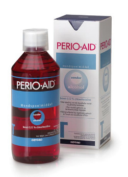 Perio-Aid Mondspoelmiddel wordt door tandartsen en mondhygiënisten aangeraden, omdat het de werkzame stof chloorhexidine bevat. Dit mondspoelmiddel kan daarom bijdragen aan een gezond en sterk gebit. Perio-Aid biedt daarnaast een goede ondersteuning van de mondhygiëne bij gevoelig tandvlees. Ook in de periode rondom tandvleesbehandelingen helpt Perio-Aid om uw mond in een goede gezondheid te houden. Dit mondspoelmiddel is ook geschikt als extra ondersteuning bij verminderde weerstand door bijvoorbeeld ziekte of stress en kan langdurig worden gebruikt (circa 2 à 3 maanden). Perio-Aid Mondspoelmiddel bevat 0,12 % chloorhexidine en 0,05 % cetylpyridiniumchloride en is alcoholvrij.
