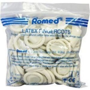 Latex vingercondooms, maat Large, gepoederd, per 100 stuks in een zakje