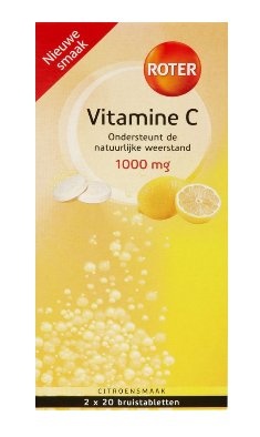Roter Vitamine C Bruistabletten Ascorbinezuur met citroensmaak. Vitamine C verhoogt de weerstand en helpt het natuurlijk afweermechanisme van het lichaam. Het bevordert de opname van ijzer uit de maaltijd. Vitamine C is vooral van belang bij tekorten in het voedingspatroon (diëten) en bij roken. Omdat vitamine C niet lang door het lichaam kan worden opgeslagen, is regelmatige aanvoer noodzakelijk. Een voedingssupplement is geen vervanging voor een gevarieerde voeding. Voor het behoud van een goede gezondheid is een gezonde levensstijl en een gevarieerde, evenwichtige voeding van belang.
