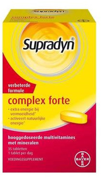 SUPRADYN COMPLEX FORTE TABLETTEN Supradyn Complex Forte, tabletten Hooggedoseerd multivitamine + mineralen supplement voor extra energie bij vermoeidheid. Dit gezondheidsproduct is algemeen verkrijgbaar. Samenstelling Bevat 800 mcg vitamine A (incl. bètacaroteen), 4,2 mg vitamine B1, 4,8 mg vitamine B2, 54,0 mg vitamine B3, 18,0 mg vitamine B5, 6,0 mg vitamine B6, 450 mcg vitamine B8, 600 mcg vitamine B11 (foliumzuur), 3 mcg vitamine B12, 180,0 mg vitamine C, 5 mcg vitamine D, 10,0 mg vitamine E, 30 mcg vitamine K, 120,0 mg calcium, 21,0 mg chloride, 25 mcg chroom, 900 mcg koper, 75 mcg jodium, 8,0 mg ijzer, 45,0 mg magnesium, 1,8 mg mangaan, 45 mcg molybdeen, 126,3 mg fosfor, 20,4 mg kalium, 55 mcg selenium, 8,0 mg zink per tablet. Dosering Volwassenen en kinderen vanaf 12 jaar: 1 tablet per dag met voldoende water innemen, bij voorkeur bij de maaltijd. Let op Niet geschikt voor kinderen tot en met 1 jaar.