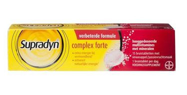Hooggedoseerd multivitamine + mineralen supplement voor extra energie bij vermoeidheid. Dit gezondheidsproduct is algemeen verkrijgbaar. Samenstelling Bevat 800 mcg vitamine A (incl. bètacaroteen), 4,2 mg vitamine B1, 4,8 mg vitamine B2, 54,0 mg vitamine B3, 18,0 mg vitamine B5, 6,0 mg vitamine B6, 450 mcg vitamine B8, 600 mcg vitamine B11 (foliumzuur), 3 mcg vitamine B12, 180,0 mg vitamine C, 5 mcg vitamine D, 10,0 mg vitamine E, 30 mcg vitamine K, 120,0 mg calcium, 39,2 mg chloride, 25 mcg chroom, 900 mcg koper, 75 mcg jodium, 8,0 mg ijzer, 45,0 mg magnesium, 1,8 mg mangaan, 45 mcg molybdeen, 126,3 mg fosfor, 20,4 mg kalium, 55 mcg selenium, 8,0 mg zink per bruistablet. Dosering Volwassenen en kinderen vanaf 12 jaar: 1 bruistablet per dag geheel oplossen in een groot glas, niet te koud water. Direct opdrinken, in kleine slokjes, bij of na de maaltijd. Let op Niet geschikt voor kinderen tot en met 1 jaar.