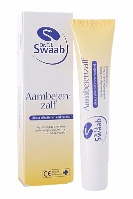 Dr. E.J. Swaab Aambeienzalf is een medisch hulpmiddel voor de behandeling van klachten ten gevolge van aambeien en/of anale kloofjes, zoals jeuk, irritatie, vochtafscheiding of een combinatie van deze verschijnselen. Hoe werkt het? De bestandsdelenDr. E.J. Swaab heeft een unieke medische formule ontwikkeld en klinisch geëvalueerd met een hoge dosering aan werkzame stoffen, zoals Hamamelis, zink, vitamines en verkoelende bestanddelen. Voorzorg Zorg voor een zachte en geregelde stoelgang. Beperk de stoelgang tot een paar minuten, blijf niet te lang zitten en pers niet. Tevens is het van belang te zorgen voor voldoende lichaamsbeweging waardoor de bloedsomloop bevorderd wordt. Dosering en gebruiksaanwijzing Breng de aambeienzalf ’s morgens en ’s avonds voor/na elke stoelgang ruim aan. En reinig de huid met de Dr. E.J. Swaab geïmpregneerde Aambeiendoekjes. Waarschuwingen De Aambeienzalf is enkel voor uitwendig gebruik en geven zover bekend geen bijwerkingen. Zelfcheck/ Wanneer naar dokter • Bij bloed in de ontlasting • Bij een aambei die niet meer naar binnen is te duwen • Bij een drukkend gevoel in de buik en loze aandrang • Als de klacht ondanks behandeling langer dan 3 weken bestaat • Als u tegelijk buikpijn heeft, een opgeblazen gevoel en moet braken • Ernstige pijn