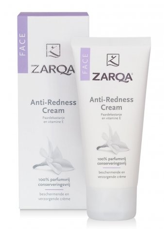 De ZARQA Anti-Redness dagcrème is een beschermende en verzorgende gezichtscrème voor de dunne, rode en gevoelige huid die met zachte en kalmerende producten moet worden behandeld. Het waardevolle plantaardige extract van Paardenkastanje en vitamine E helpt de natuurlijke huidbarrière te versterken waardoor gevoeligheid en roodheid door koude, warmte en weersinvloeden minder greep op de huid krijgen. Paardenkastanje heeft een stimulerende werking op de bloedcirculatie en zorgt voor behoud van een sterke vaatwand. Gebruik: ‘s morgens aanbrengen op de gevoelige en rode delen van het gezicht. De gezichtscrème kan ook worden gebruikt als nachtcrème. In geval van een (zeer) droge huid kunt u voor de overige delen van het gezicht de ZARQA voedende dagcrème gebruiken. Waarom de ZARQA Anti-Redness gezichtsverzorging? - zachte, kalmerende crème die de rode gezichtshuid tot rust brengt - verstevigt de huid barrière - vermindert roodheid en gevoeligheid - vrij van parfum, allergenen en conservering